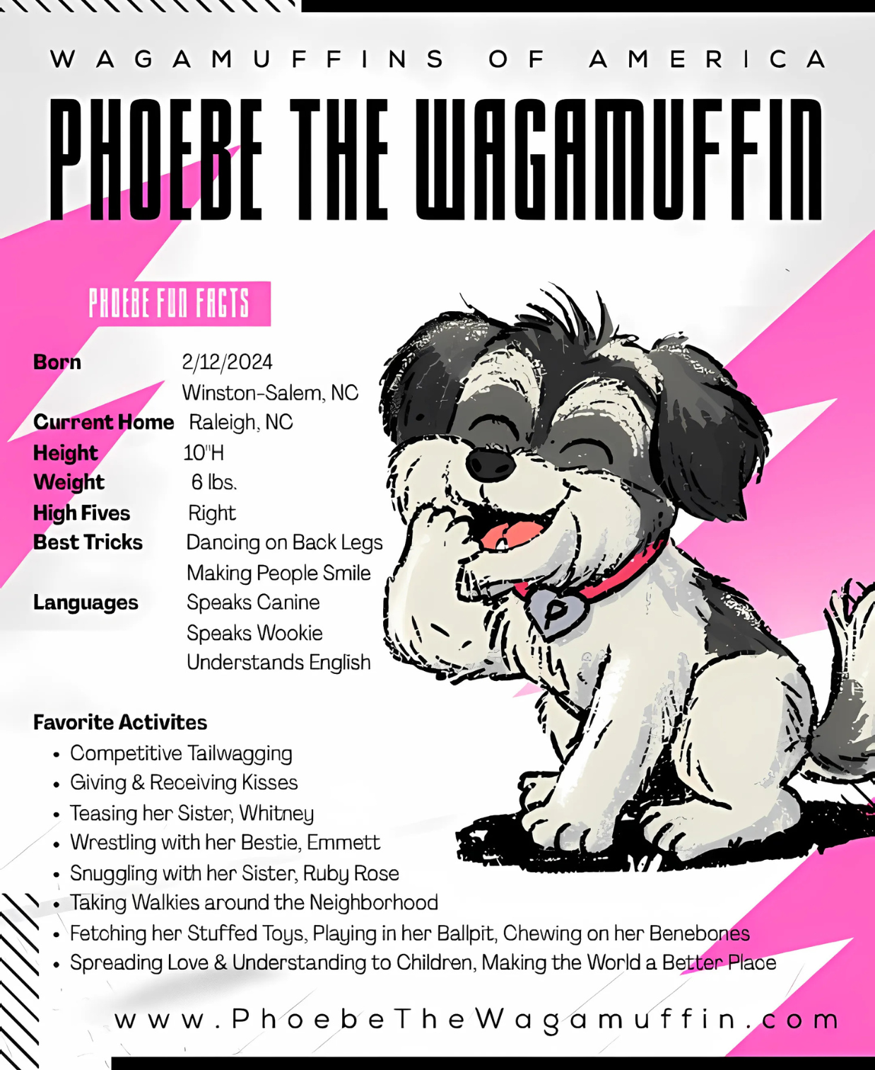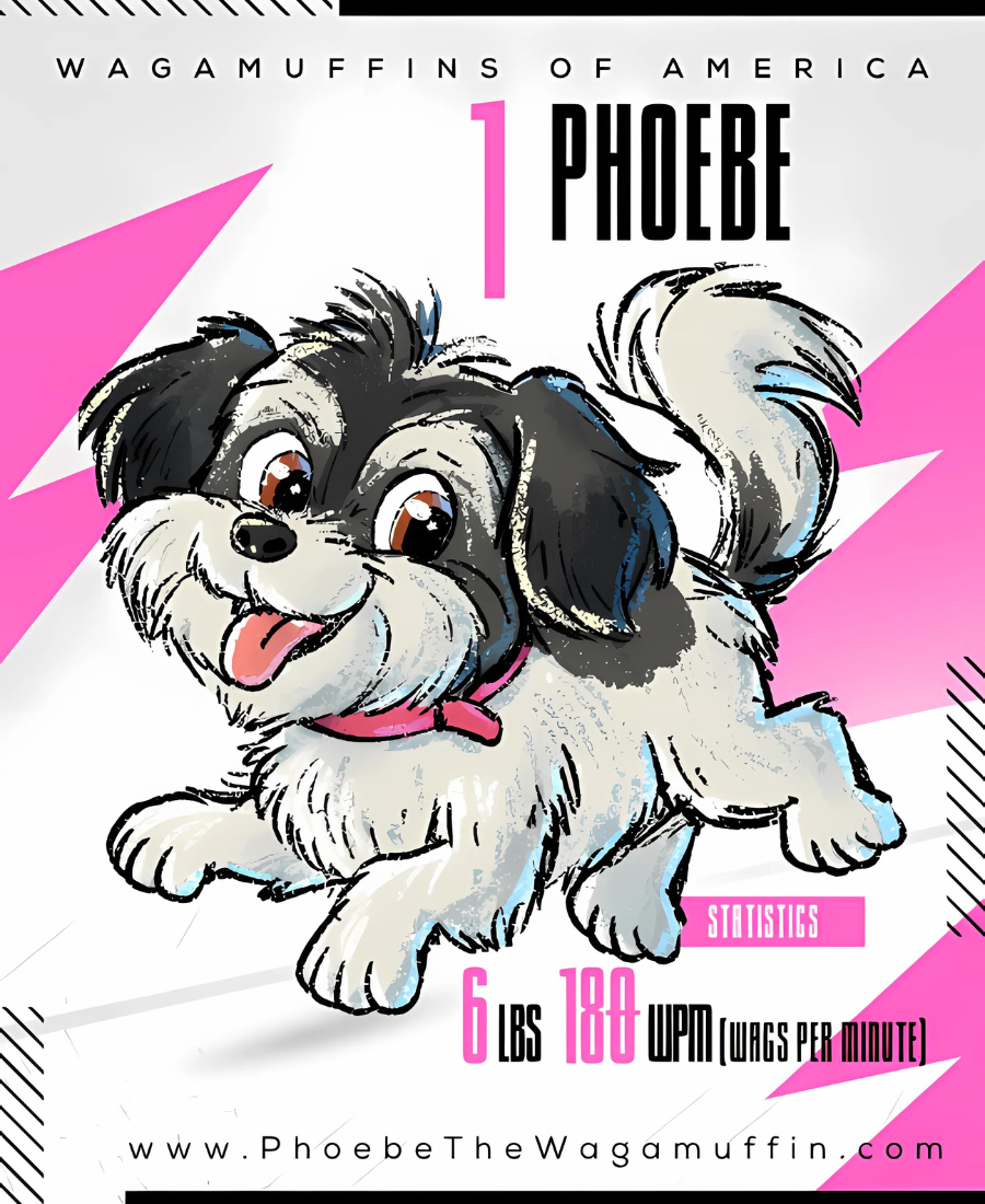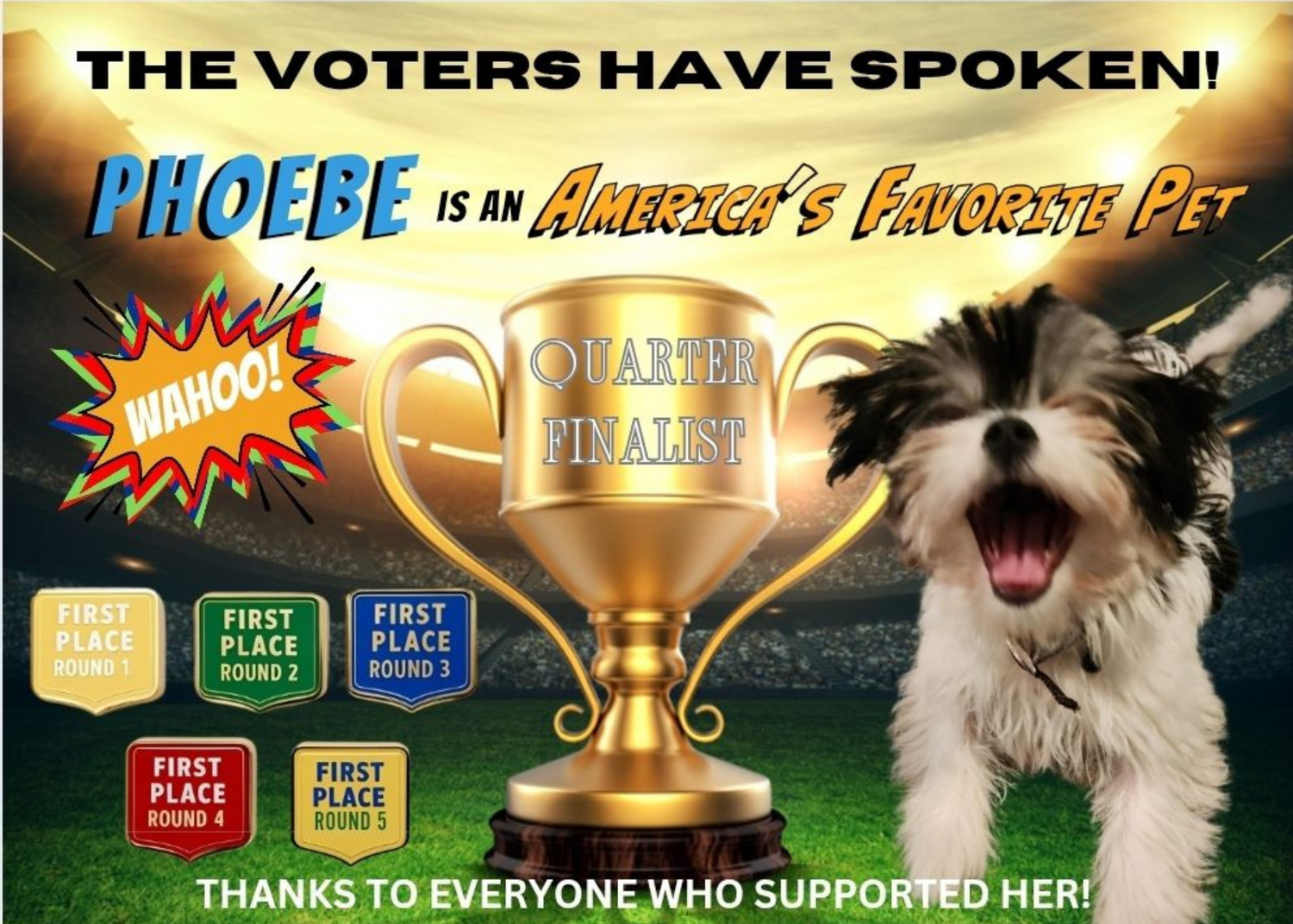 In early 2025, a creative Facebook campaign introduced Phoebe to thousands of fans, earning her 5th place in the quarter finals of the annual America’s Favorite Pet competition! Not bad considering there were over 375,000 initial contestants. She looks forward to 2026 when she hopes to emerge as Top Dog!